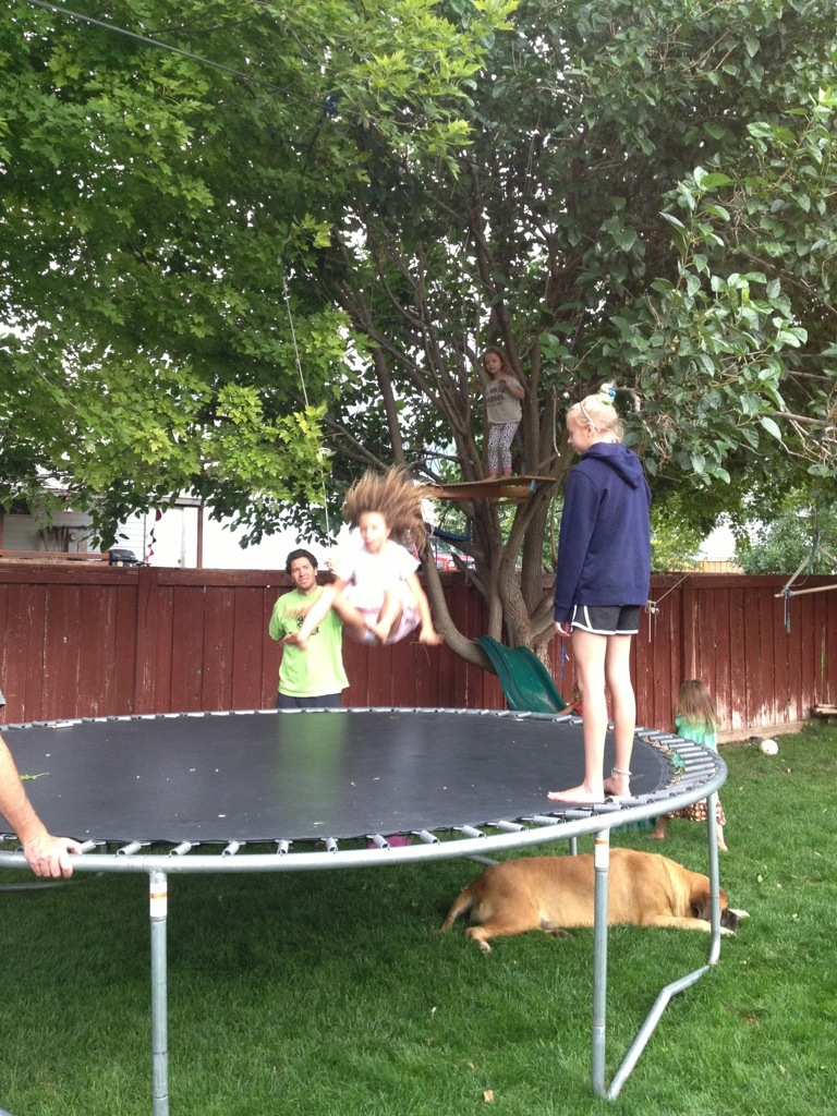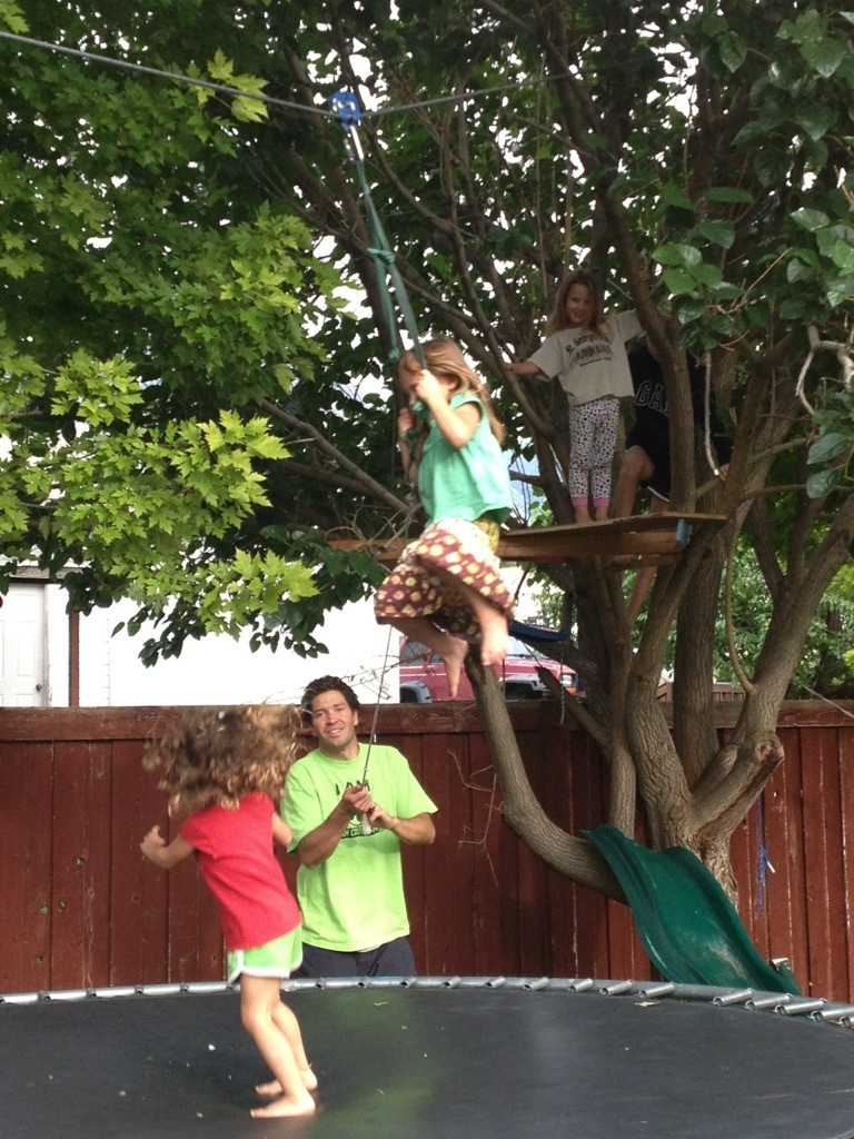 The girls and the Fullmers playing on our zip line. The kids are letting go half way down onto the trampoline…