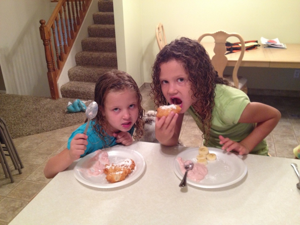 Good old treadmill. I was 4 1/2 min into my run when one of the girls needed help with something so I paused the treadmill. I started back up and ran until I got to 17:34 and I heard the shower turn on. I went and all the girls were getting in the bathtub for a shower bath. So I helped them and then I decided to feed them first before I finished my running. We had scones for Lina’s birthday. 🙂