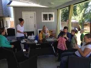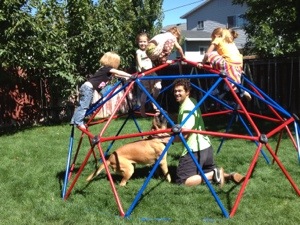 And then we migrated to my house (which explains the top picture…). This bottom picture is with the kids and of course Corom (and Kittie our English Mastiff puppy) right in the middle of the chaos.