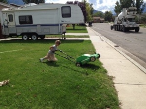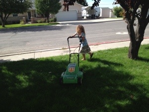 They asked if they could mow the lawn… How could we say no! Next time we will have to show them how to go straight forward. 🙂 Our lawn looks interesting but at least that buys me a week from mowing.