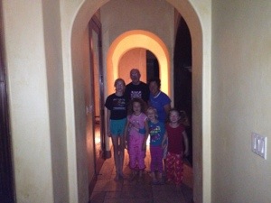 We (the Fullmers, Booths, G-goat and us) played hiding go seek (after priesthood session). Rules are… No lights except for the hallway. Talk about freaky… My 2nd child and I were it. Once you found someone they had to come with you. I turned the hall light on so you can see the picture better…