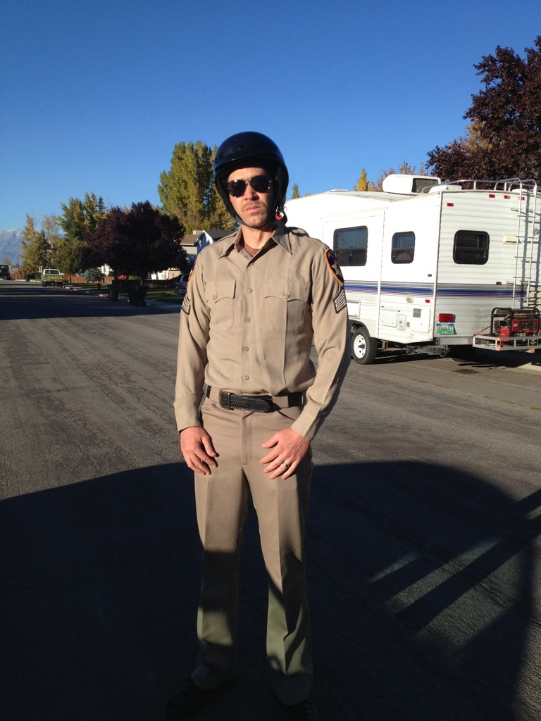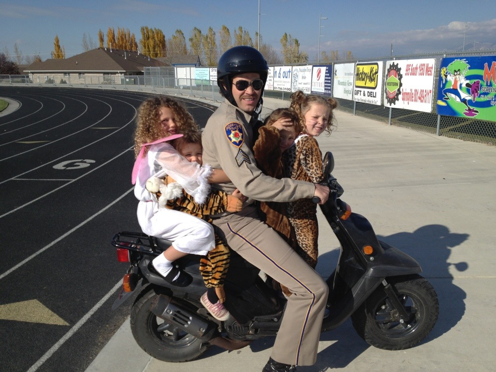 I guess he helped direct traffic for the cross country kids today, he escorted high school kids to their destination (he was on my scooter today driving around), he did bag snatching prevention, and on and on… It was funny all day and the kids at all ages loved it (and even the adults)! 🙂