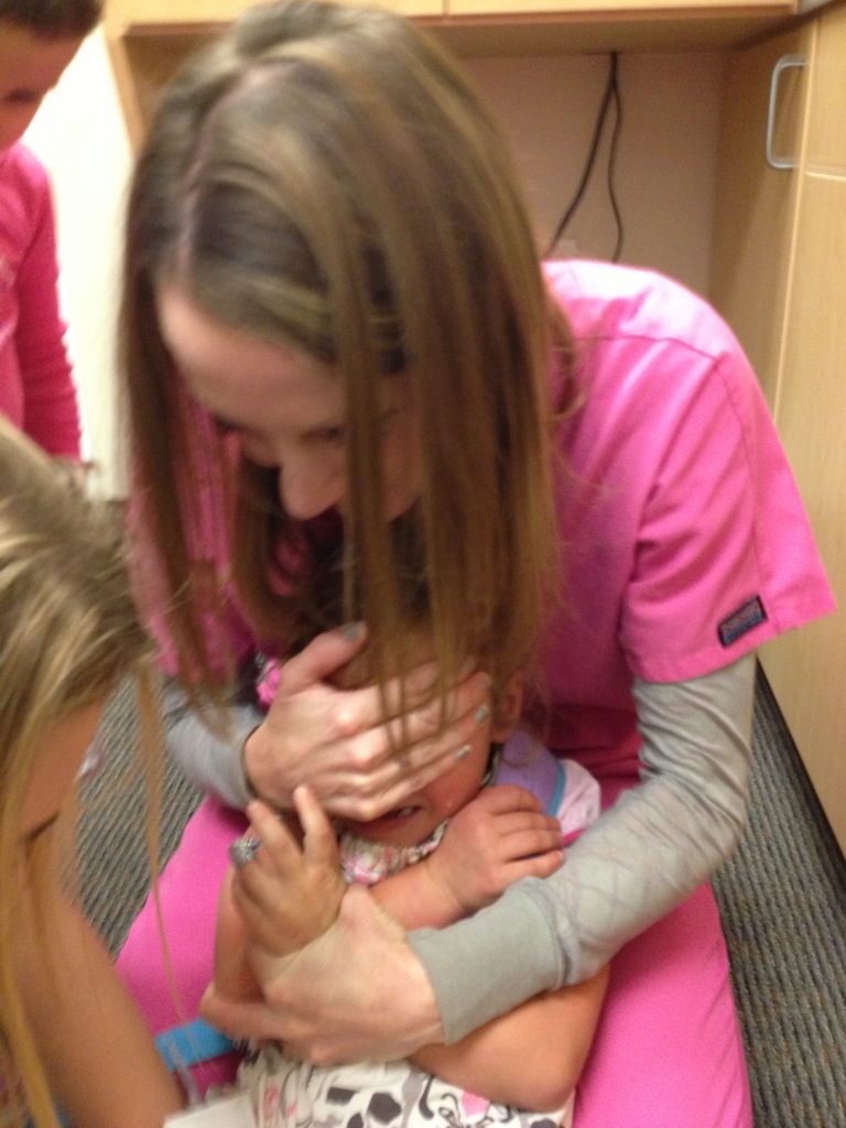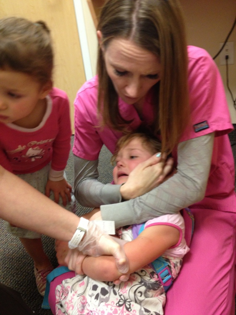 She was so scared to get her shots but we had two nurses come in and calm her down. One nurse did the shots and the other held her and covered her eyes so she couldn’t see it.