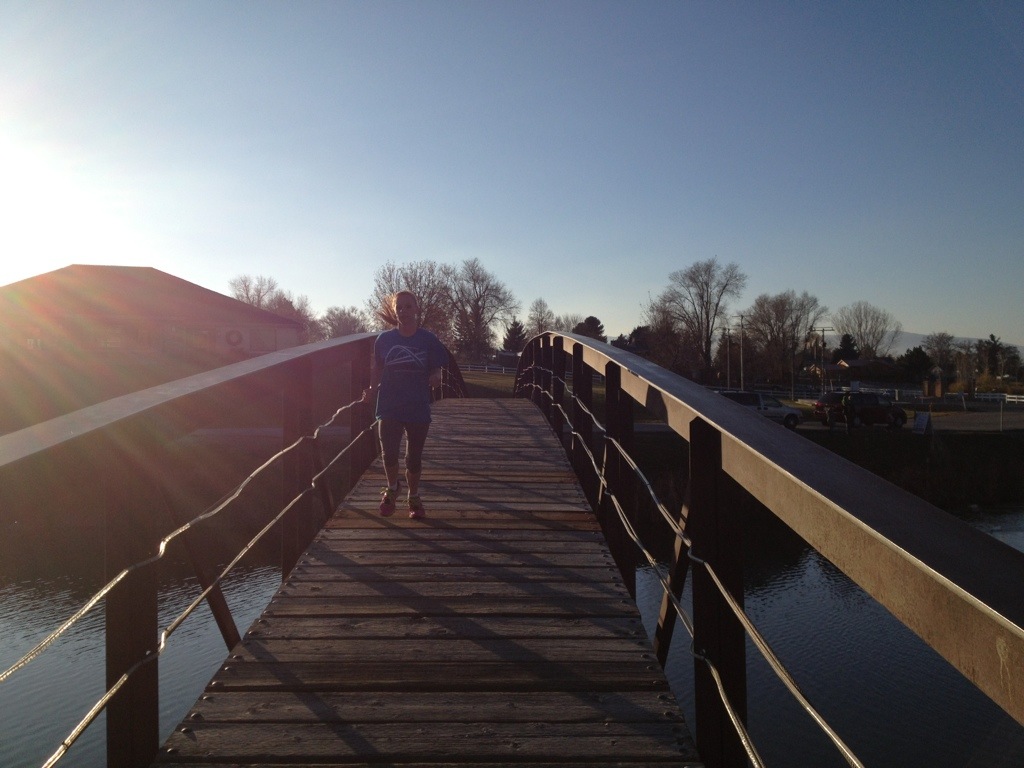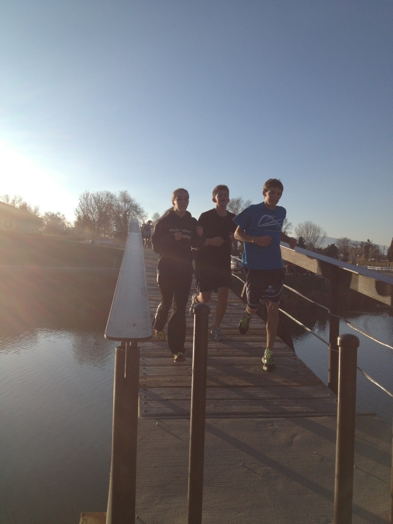 Once they crossed the bridge they began a 1200 loop at 5k race pace. The 1st half was uphill and the 2nd down. They continued to the pond and ran their cool down lap. They did the loop 3 times.