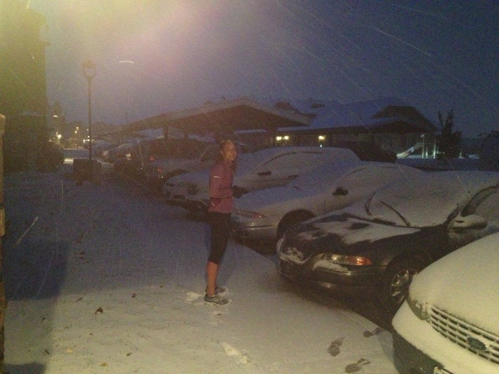 I met up with Melissa at 6 this morning in Payson (and we picked up Rachelle at 6:15). When I walked out of my house, there was no wind and the snow was nicely falling. I debated whether to go back inside and grab my face mask, gloves and an extra jacket but decided not to because it was the lighter fluffy snow. I drove into Payson and it was a little windier… Melissa and I started and running in the snow and wind was hard. We could not see, our faces were cold and the snow was hard and it hurt our faces as it hit! We ran back to Rachelle’s place and told her she had to come with us. We ran the same 2 mike loop back and forth. We wanted to stay close to our cars. 🙂 Running out was nice and enjoyable with the wind and snow against our backs but turning around on the loop was the real adventure. I don’t know what the other 2 did but I tucked my chin down to my chest, had my eyes barely open and would put my hand up to shield my face. Our pace did pick up every time we ran back just so we could get done with the pelting, hurting snow. At the end my head felt like an ice helmet. Good times! We ran 6.7 miles in 53:36.65.