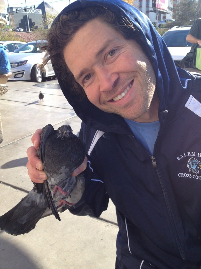 We stopped off in Las Vegas for lunch. Corom was up to his usual pranks (and being around the HS kids brings it out more)… He caught a pigeon…