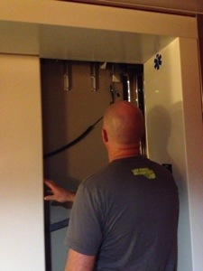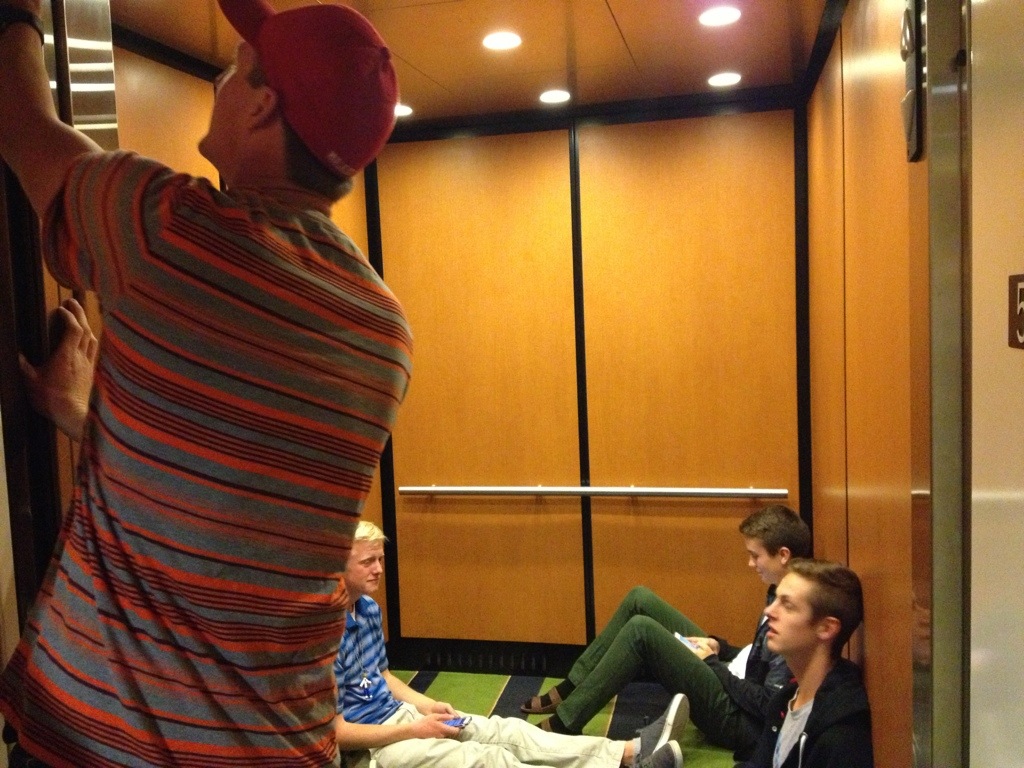 When one of the girls on the team got a phone call from one of the other teammates, saying they were stuck in the elevator… The other coach (Thompson) and I went up to the 5th floor to see what was going on. Sure enough, 3 of our runners were stuck in the elevator and the alarm was going off. The door was open just a crack…
