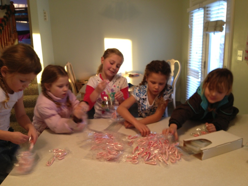 My girls, a good friend of ours daughter (her mom just had a baby so she cane over to play) and I worked on our Christmas activity for the day. We were putting goodie bags together for our neighbors. The kids were having fun… I was a little irritated because they were breaking all the candy canes… But at least they were having fun. π