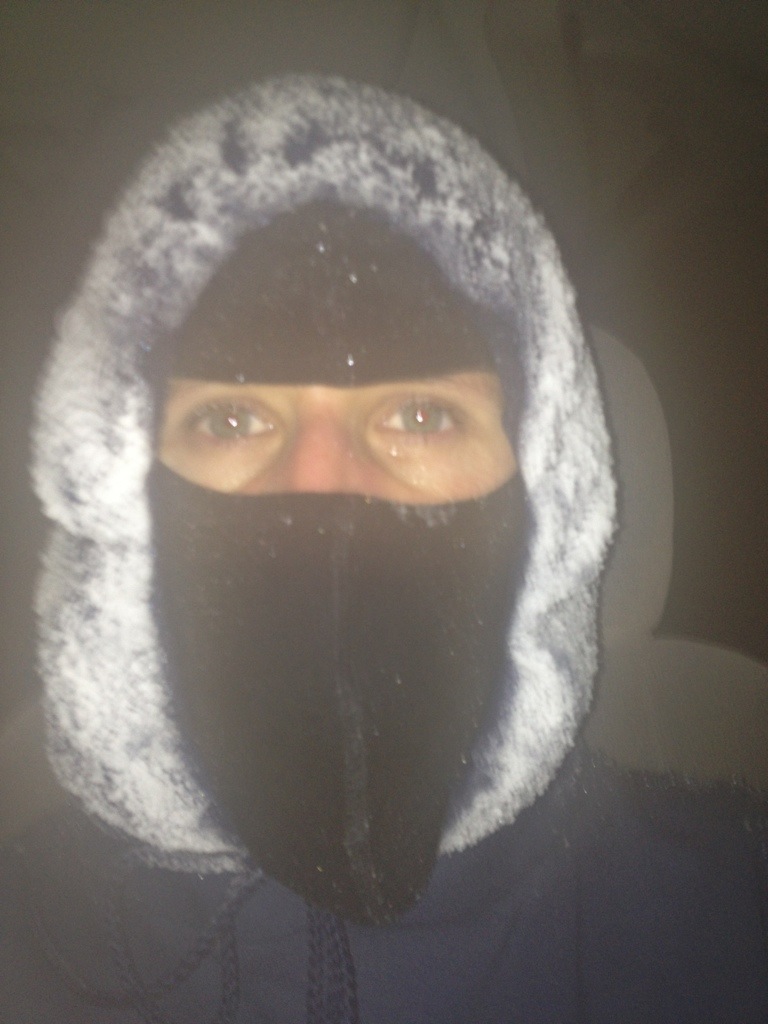 I met up with Amber, Mac and Holly this morning. It was 3 degrees today (so not as bad as yesterday :)). I did dress with even more layers today and I was WARM! It was a very pleasant run, even though we were covered in ice. We ran 8 1/2 miles in 1:08.42. I took this picture of myself as I was sitting in my car…