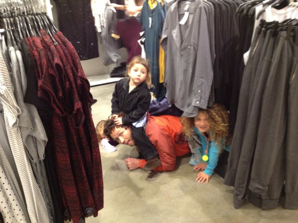 I should have been the one to give the lecture with Corom sitting right in the middle. We tried to keep the girls entertained while Z shopped by playing follow the leader. I can’t remember which child was the leader (one of the older 2) but she went under a rack. Corom had our youngest on his shoulders and decided to attempt crawling under the rack to follow. It didn’t go over to well…