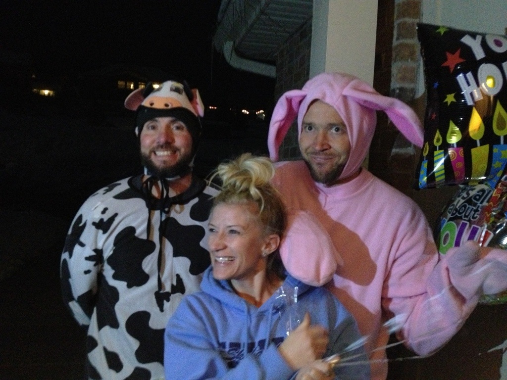 The girls went to bed and 3 other running friends, Corom and Mike Fullmer and I showed up at Mac’s house (for her b-day) and the 2 did “Hoppy/Moo” birthday. It was great.