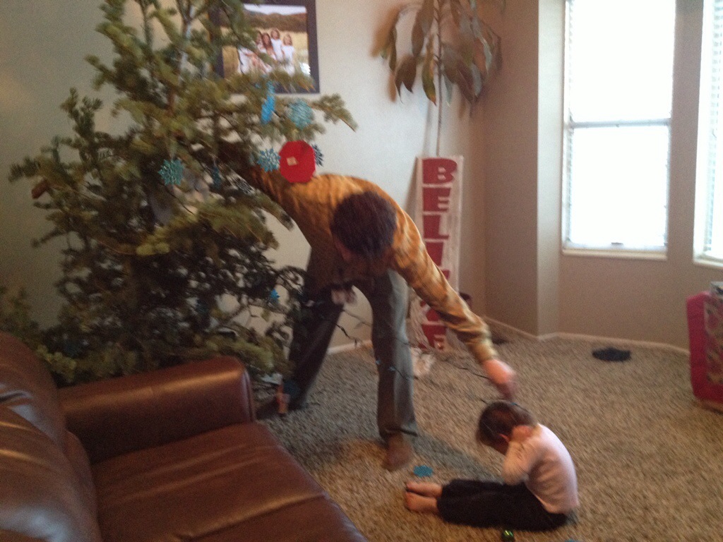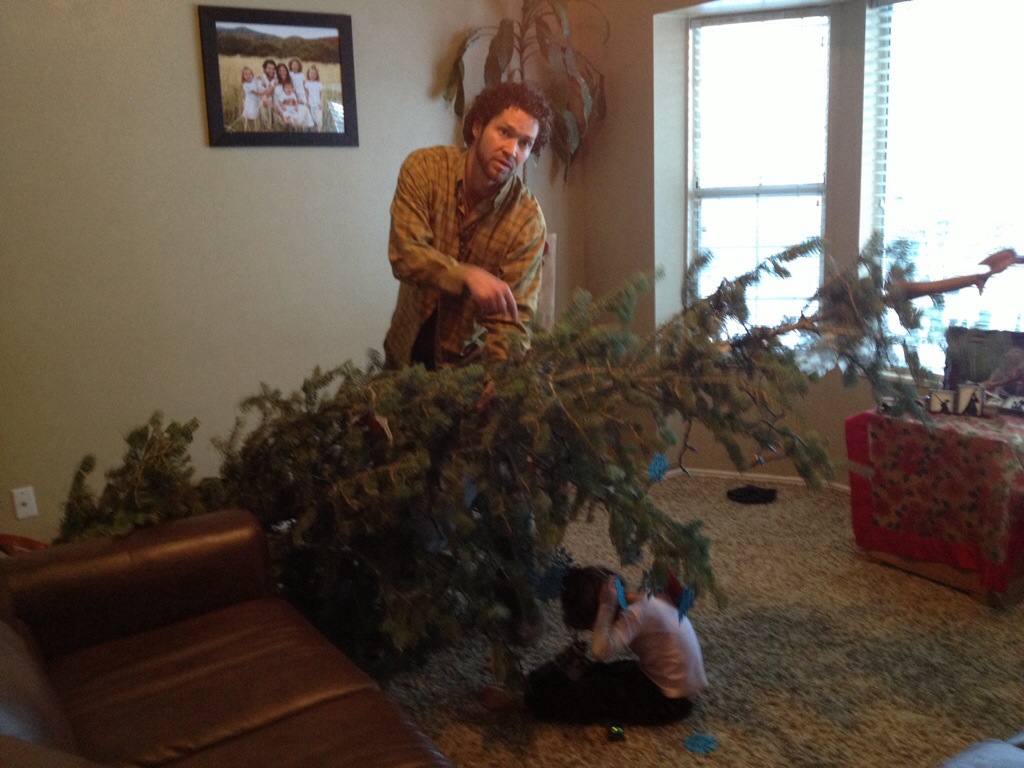 We heard a thump this morning as we were getting ready for school. Our youngest (3 year old) decided to climb the tree to get an ornament she wanted. As you can see, that didn’t turn out to well. Her hair also got caught in the lights.