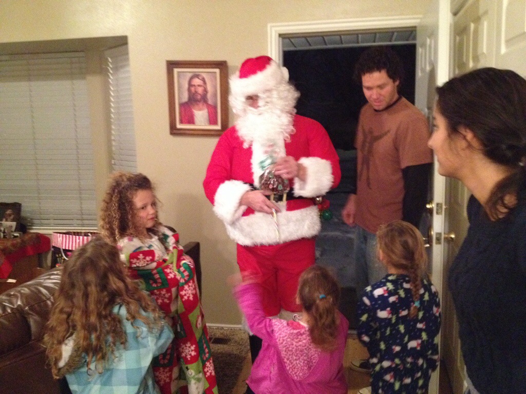 I didn’t have my phone all day because it has been at the sprint store… Something was messed up with it. I am glad it was fixed for this event tonight! Thank you to the dear friends/neighbors that sent Santa to us and sang us songs!