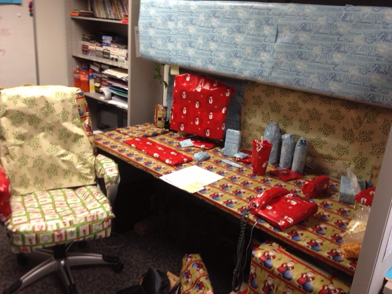 Everything on his desk and around his area was wrapped in wrapping paper. Pretty clever and funny!