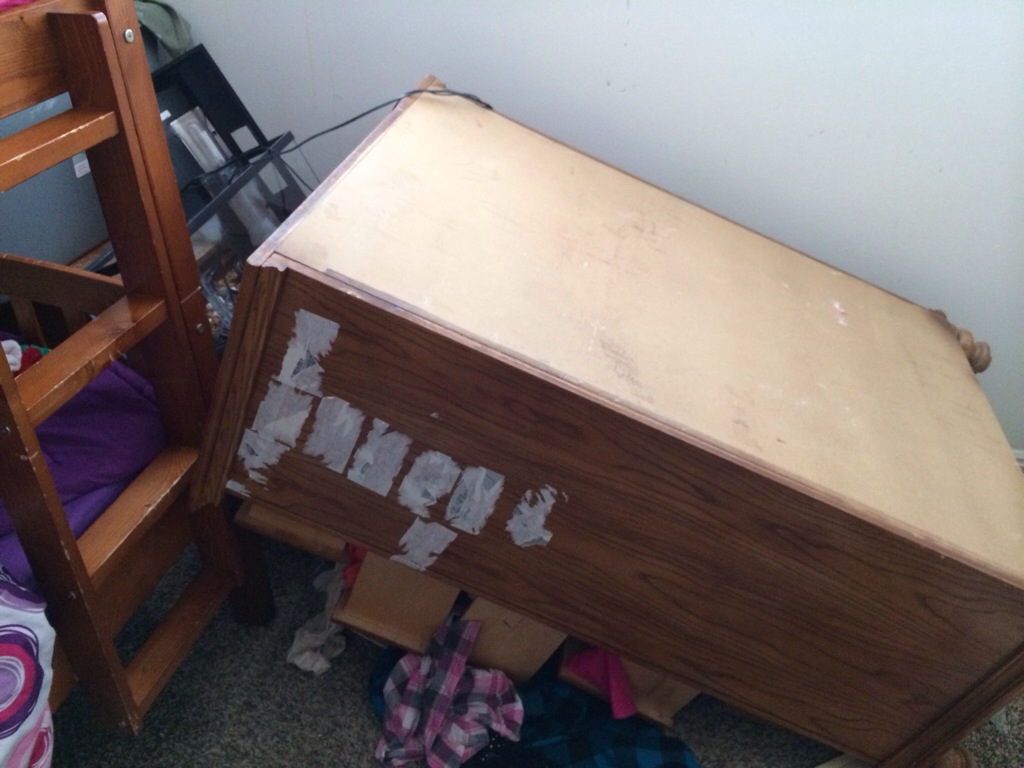 Well today I had 3 extra kids that I watch on Fridays for a friend of mine. They were all playing, doing their normal thing when I heard a crash… I ran upstairs and I saw their dresser tipped over and crying…