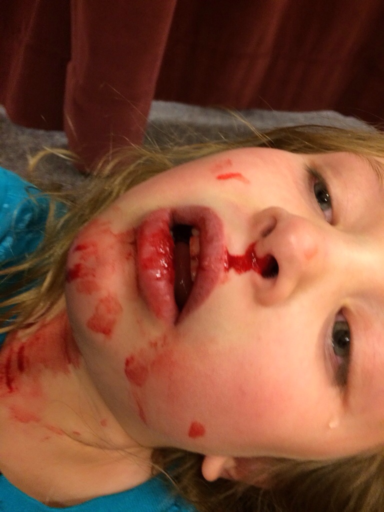 Needless to say… I stopped playing and went to help Corom take care of her and clean up the mess. She hit it on a chair and cut her lip and had a bloody nose. She was good to go once we got her cleaned up. Never a dull moment!