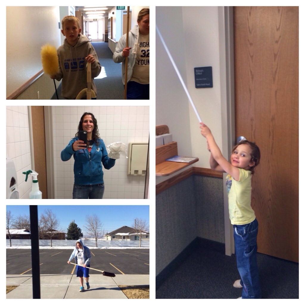 The girls and I went to the church this morning to clean. There were a couple of other families that came to help also. (It was our “blocks” turn this week.) Corom planned his scout camp out just right… Come back right after we were done cleaning. 🙂