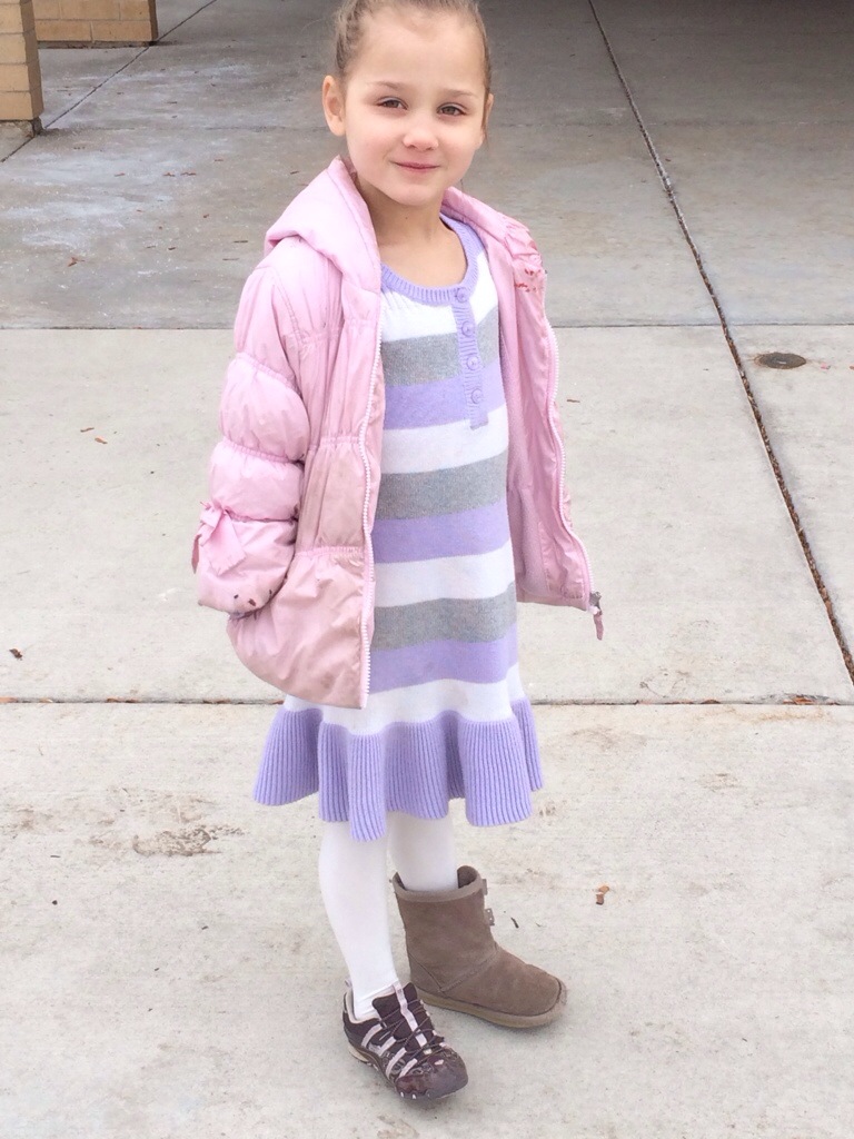 She actually does this a lot and maybe it is my lack of not being to picky with what they wear that leads to this. Sometimes she will go to school with 3 dresses on at one time… I think it is cute! She did great today in speech, though.