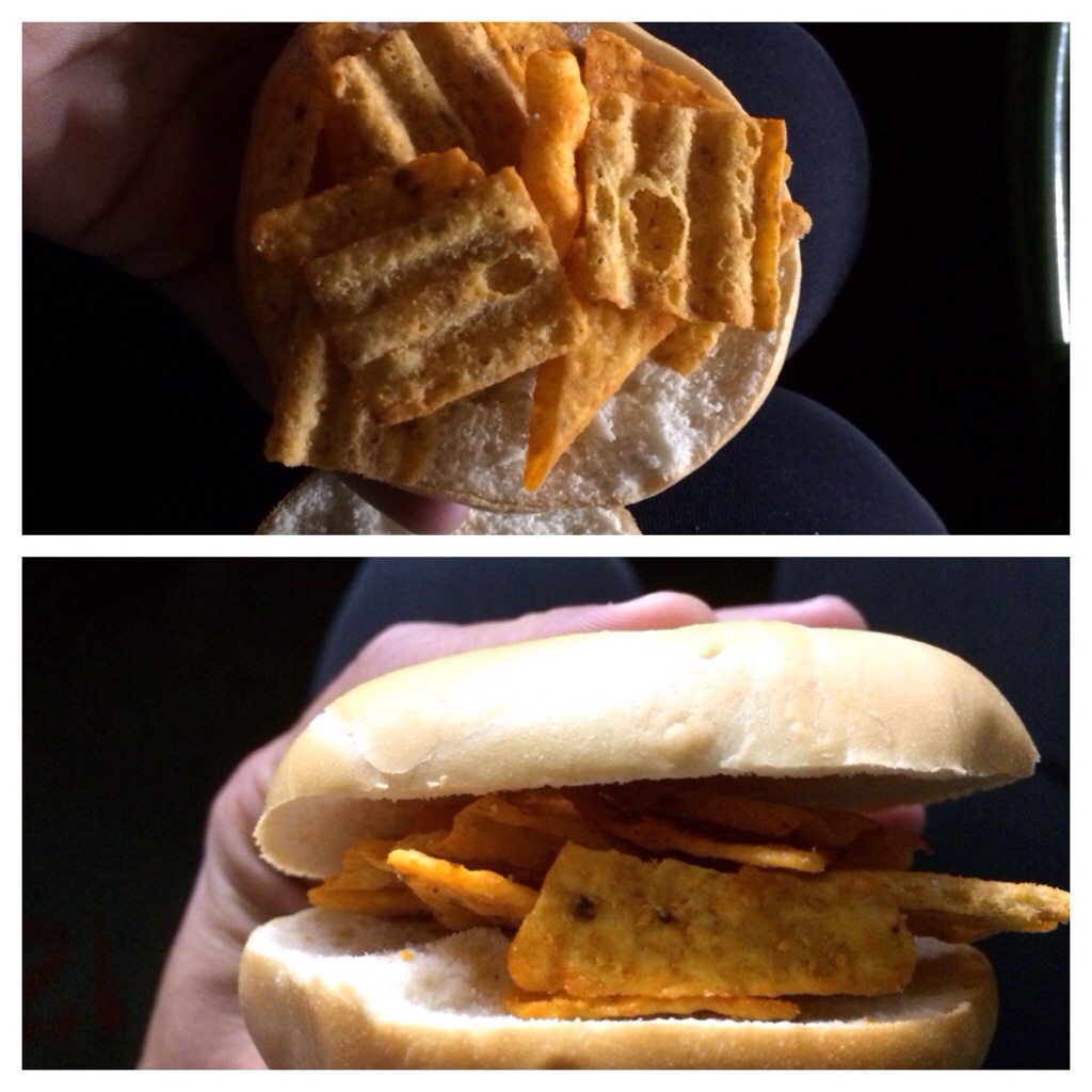 I made myself an amazingly healthy and great sandwich out of a bagel, Doritos, Cheetos, and Sun Chips…