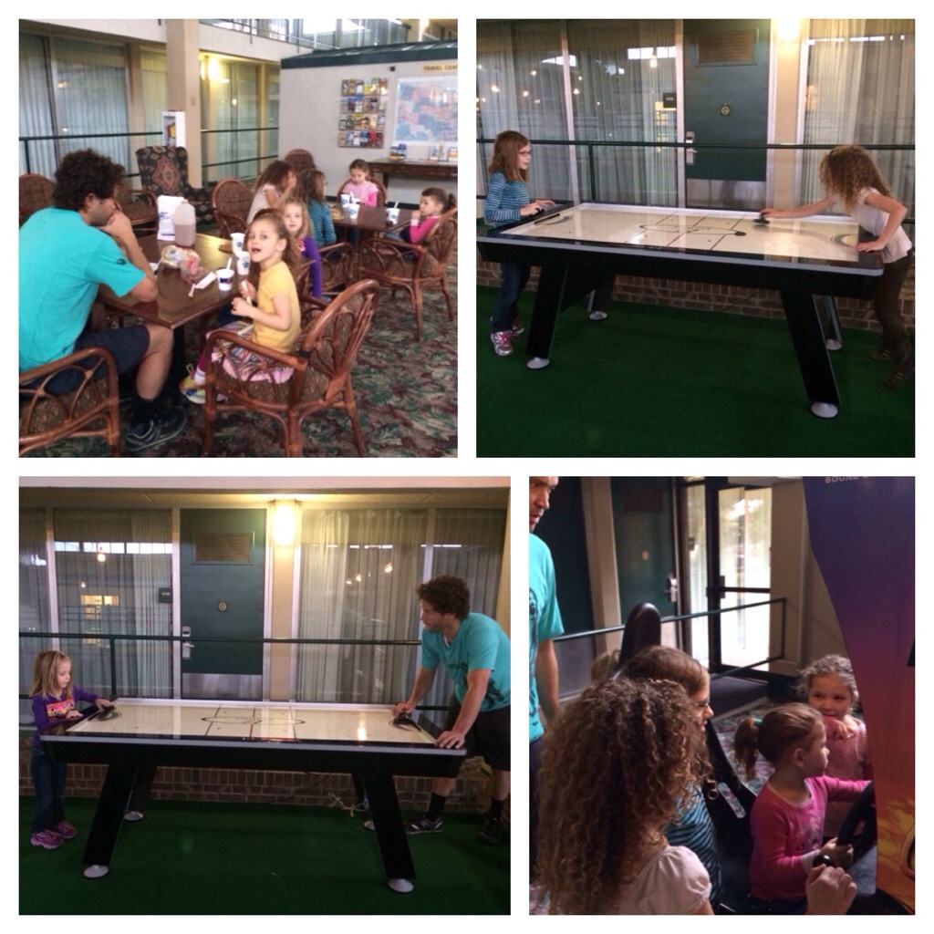 I didn’t take the bus to the meet this morning… I hung out at the hotel with Corom and the kids and the other coaches’ kids. Our first race wasn’t until 9:30 and the bus had to leave by 7:30 a.m. Of course my kids with the excitement of a hotel… got up at 6:15.