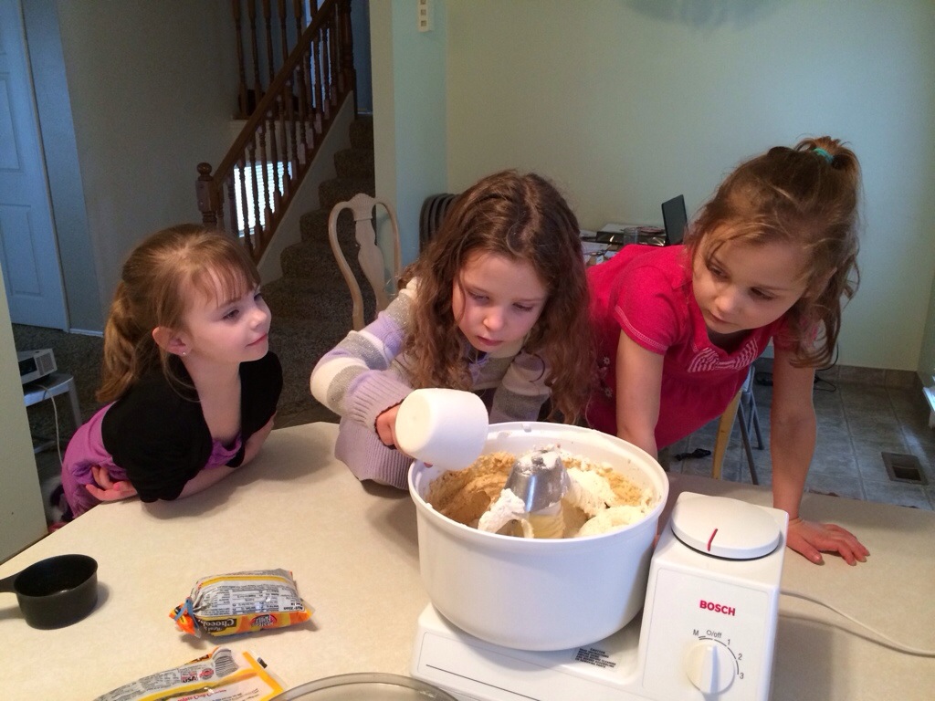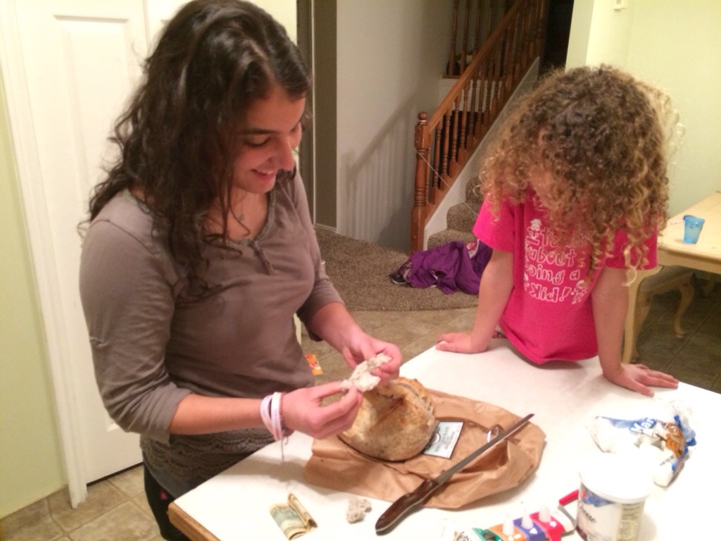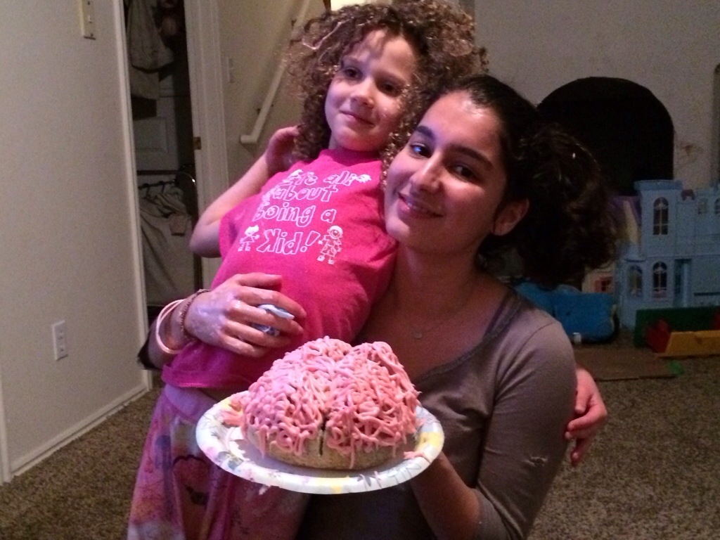 We did our normal Wednesday night routine (with Corom working late). Z (our Foriegn exchange student) came to me right when I put the girls to bed and said she had a project due tomorrow. She had to make a brain out of food… So I took a trip to the store (she watched the kids) and I bought a loaf of round dessert bread and frosting…