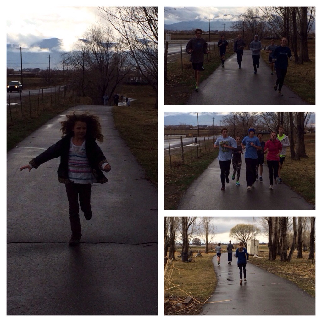 The high school kids went for a mile warmup and then ran 4 to 6 times around a 1200 meter loop (3/4 of a mile). The first half was at a cruise interval speed, then the next quarter was a little faster, and the last quarter of the 1200 was a recovery jog… They ran a 2 1/2 mile cool down.