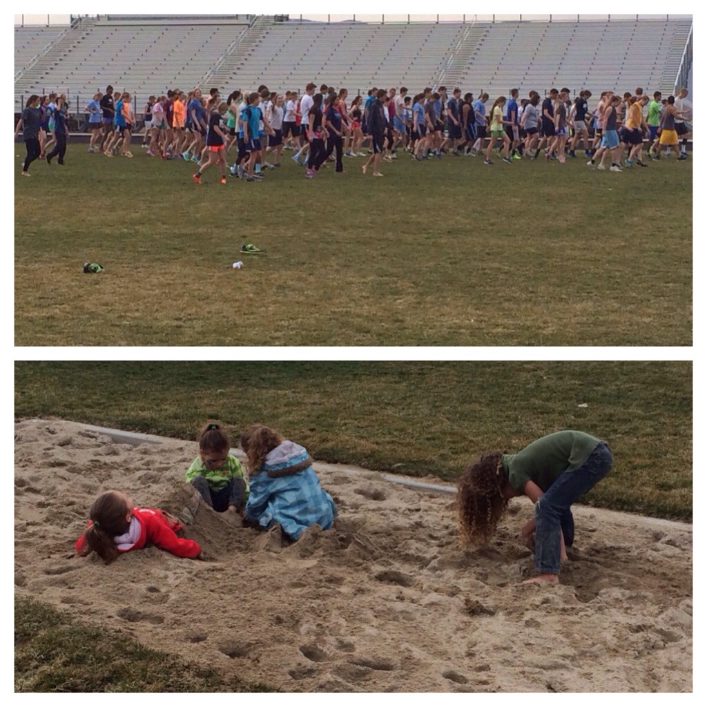 The girls and I went to track practice. I sent the high school kids on a 5 to 6 mile recovery run and my girls played in the long jump pit. 🙂