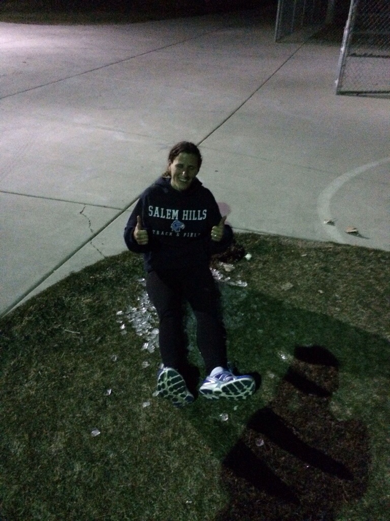 1st: 1:27 ; 2nd: 1:27; 3rd: 1:27; 4th: 1:27; 5th: 1:27; 6th: 1:26; 7th: 1:27; 8th: 1:26; 9th: 1:24; 10th: 1:25; 11th: 1:26; 12th: 1:27; 13th: 1:25. We finished off with a 2 mile cool down. The 400’s felt good (it took the 1st 2 to get into it) and of course my legs hurt throughout the workout but I was able to keep going. The cool down seemed to hurt more than the workout. ๐ So I found a pile of ice on the ground from last night’s track meet and took advantage of it…