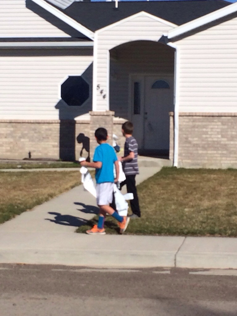 I had scouts today… We had to deliver bags (the canned food drive) to every house in a certain area today. We just had the boys run up and down the streets/neighborhoods.
