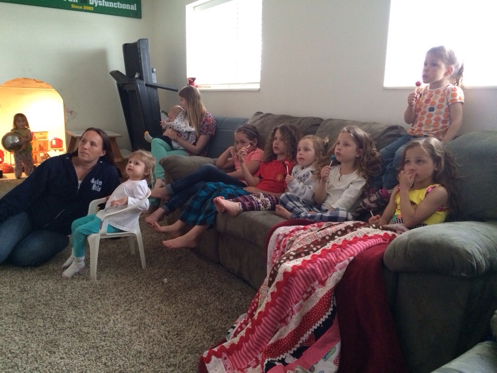Corom and Z left for Youth Conference (a church weekend activity). I had a few friends over with their kids because their husbands also went on the church outing. We ordered pizza, the kids played, had brownies, suckers, popcorn, watched a movie, and played night games… My girls even had soda – very rare occasion. 🙂