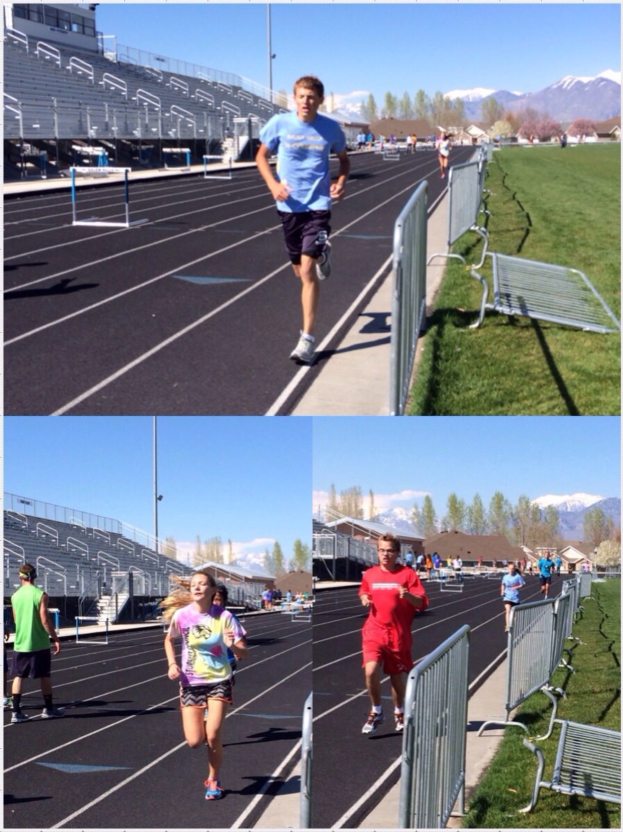 At track practice half the distance kids ran a hard speed workout (2 600’s at a little slower than mile race pace, 2 400’s at mile race pace, 2 600’s at mile race pace, 4 400’s at 3 to 5 seconds faster than race pace). They ran a mile for a warm up and a mile for a cool down.