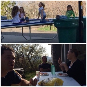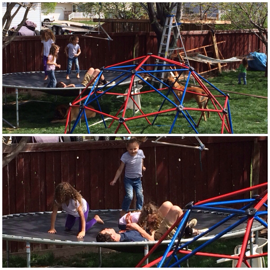 And then the girls saw dad (Corom) sleeping on the trampoline; they decided to wake him up.