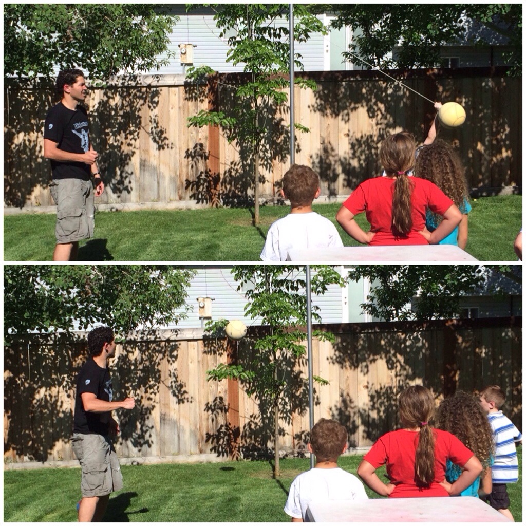 We stopped off at a neighbors for a little while (and Corom had to make sure he beat all the kids in tether ball)…