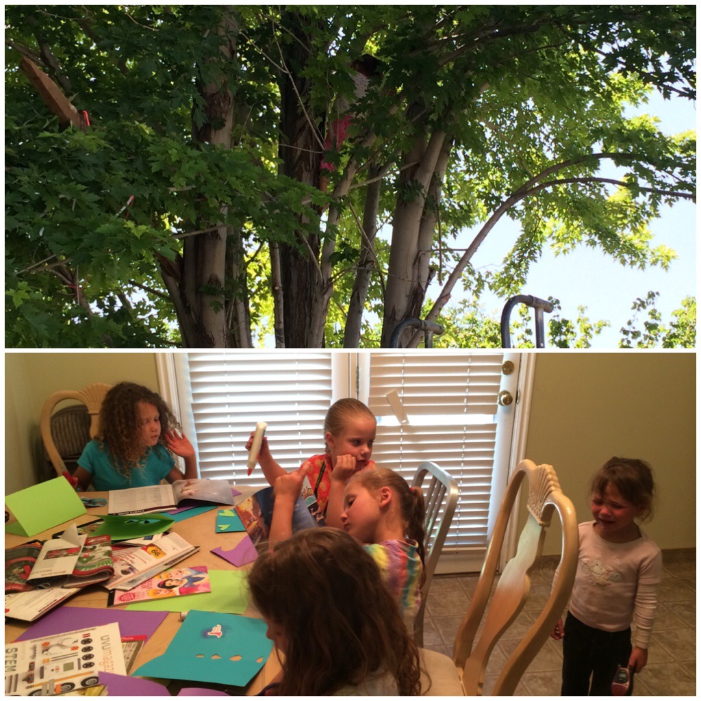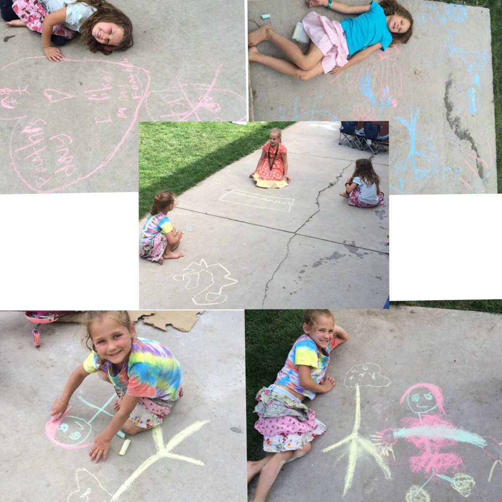 Then I took the girls to a $1 movie at our local movie theatre (they showed “How to train your dragon”). We came home, cleaned, worked on crafts, climbed trees, and did some chalk art…