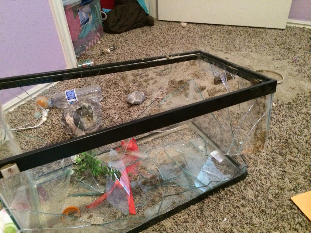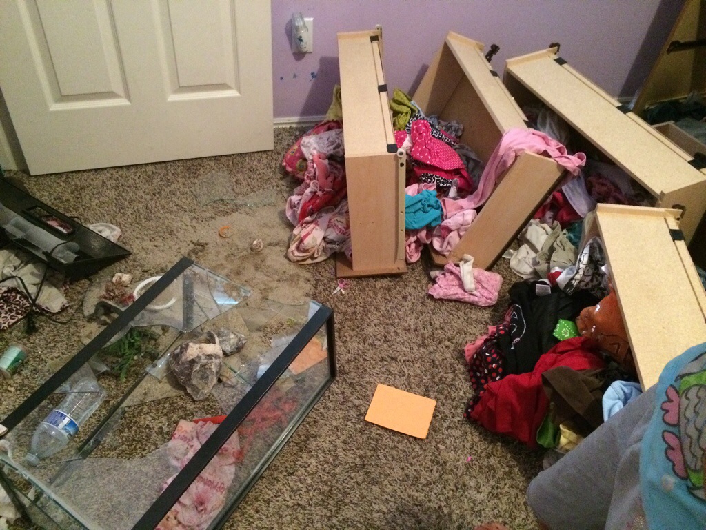 This is the mess I was going to have to clean up! Glass, sand, crab food and a little poop mixed in with all of that. I don’t know why the dresser fell over but I’m glad no one was up there. Oh, on a side note… This happened Thursday morning, it is now Friday and the mess is still there. I told Corom he was in charge of that. A little after breakfast my daughters come in crying because our dogs (well the older one)…
