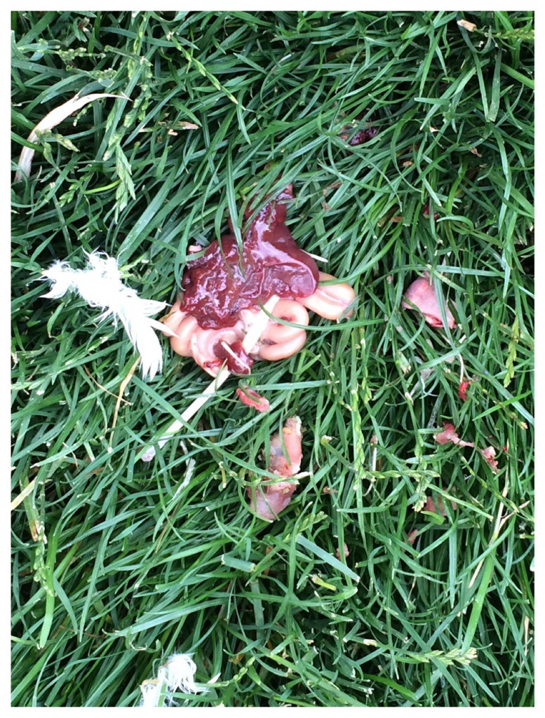 …Ate 2 of the girl’s chickens. They said they were missing and their feathers were in the yard. This is what was left of them (sorry for the disgusting picture… But I had to pick it up and throw it away).