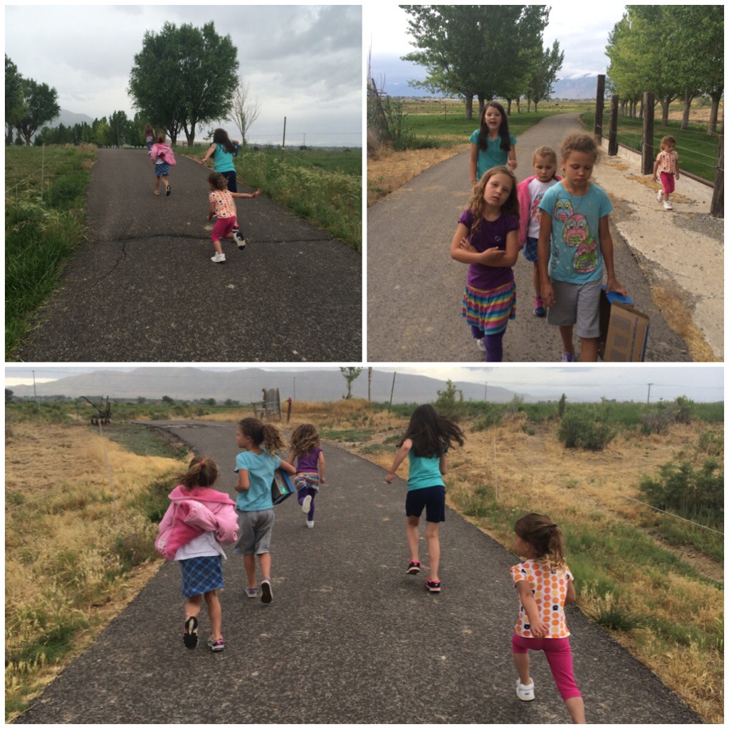 After about 13 young women (12-18) from my church came over. We made scones and of course ate them. A few track kids also showed up (randomly) to visit. It was quit the crowd. One of the girls saw Corom mowing the lawn and asked if she could take over (it was her 1st time). Of course he didn’t want to hurt her feelings and say no, so he let her. 🙂 Shoot, I think I will see if they want to come over once a week. The Fullmer’s came over for dinner (Navaho tacos) and then I took the girls to this pathway (Christensen’s loop- 3/4 of a mile) and we went frog hunting. They ran a loop first (on my request) and the 2nd time around was the frog hunting. The sad faces are for not catching any.