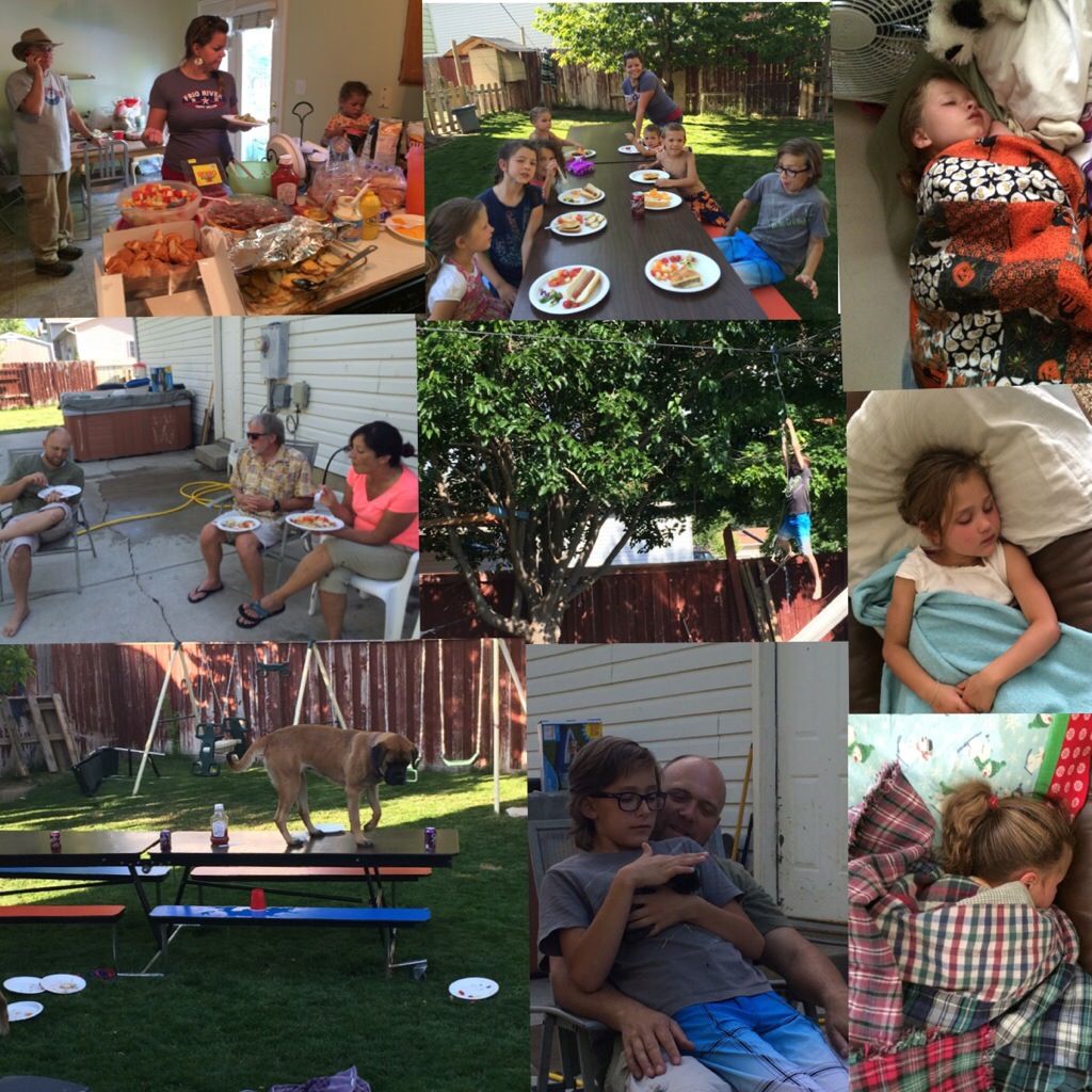 We hung out with family and neighbors back at our house. We barbecued and played around in the backyard. (Yeah our dog, Kittie, jumped up on the table when we went inside to start cleaning up.)