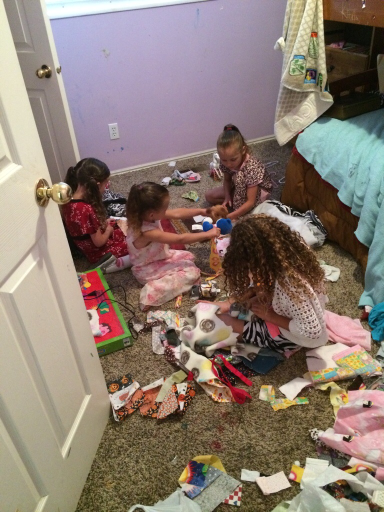 They did spend a lot of time playing with a bunch of material they got from their grandma (G-Goat). Thanks G-Goat. No messes there to cleanup. 😉 We did have a family over for dinner tonight. It was nice to visit and hang out. Later I put the girls to bed and Corom and a few other guys went up the canyon to get stuff ready for girl’s camp (a few hundred girls and many leaders- myself included) will be going up tomorrow. It should be fun!