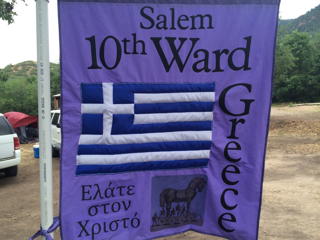 It’s at South Valley Gym. After cleaning, packing and getting things ready for the girls… I left for our church girl’s camp. Corom was at work and one of the girls I coach watched the kids. They had so much fun! I stayed over night camping (the camp goes from Monday-Thursday). I’m going Monday, all day Tuesday, come home late Tuesday night and then I will go back Wednesday afternoon until late Wednesday night. The theme for girls camp is the Olympics. Each ward (group) picked a country. We were Greece. 🙂