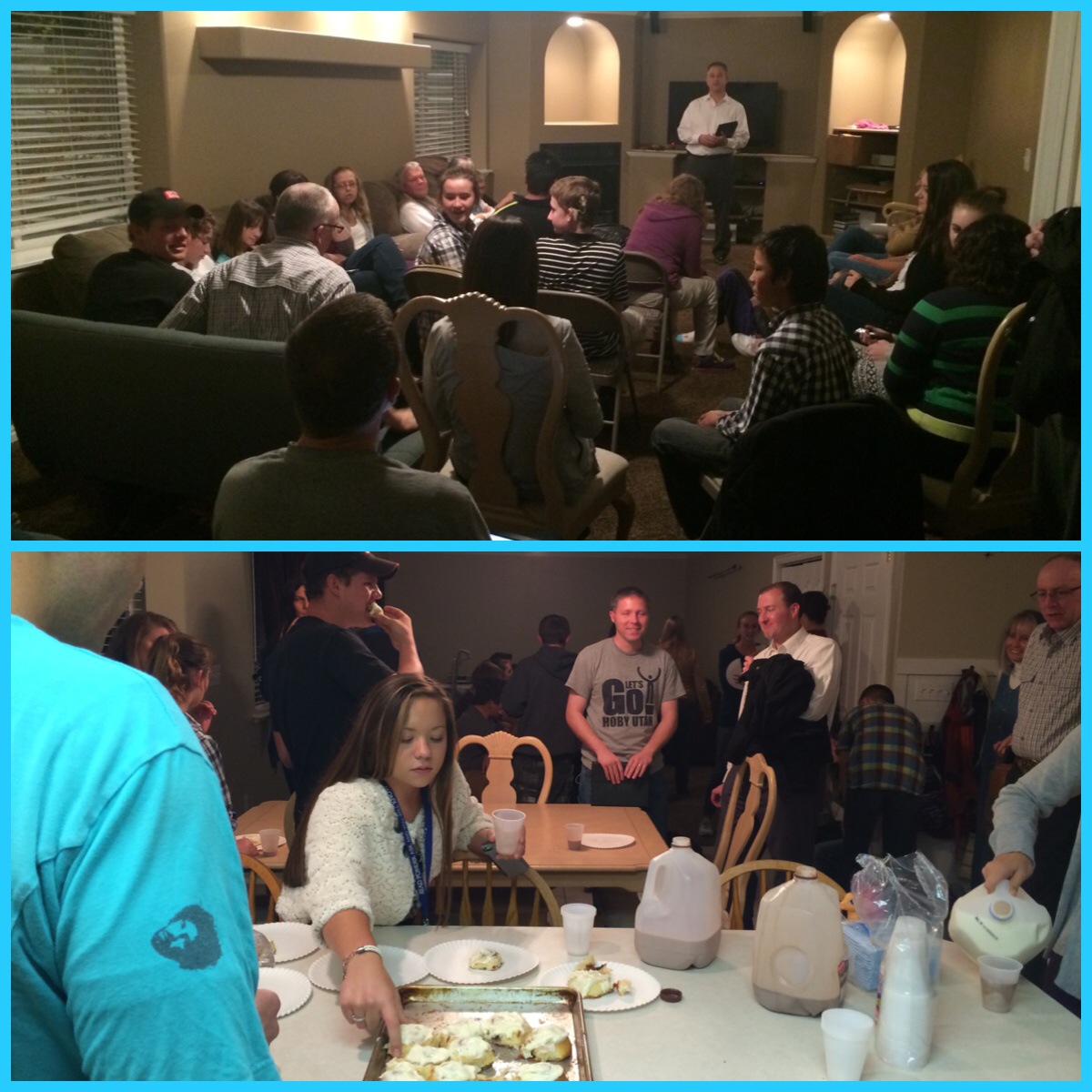 Sunday: Church was really good today! The girls were good, the testimonies were excellent & the classes were good. We had some of my running friends and their families over for dinner (Amber, Rachelle, Scott, Melissa & Megan). Soon after many of the YW/YM from the ward (church) came over for a little talk (fireside) and ate the cinnamon rolls Corom made.