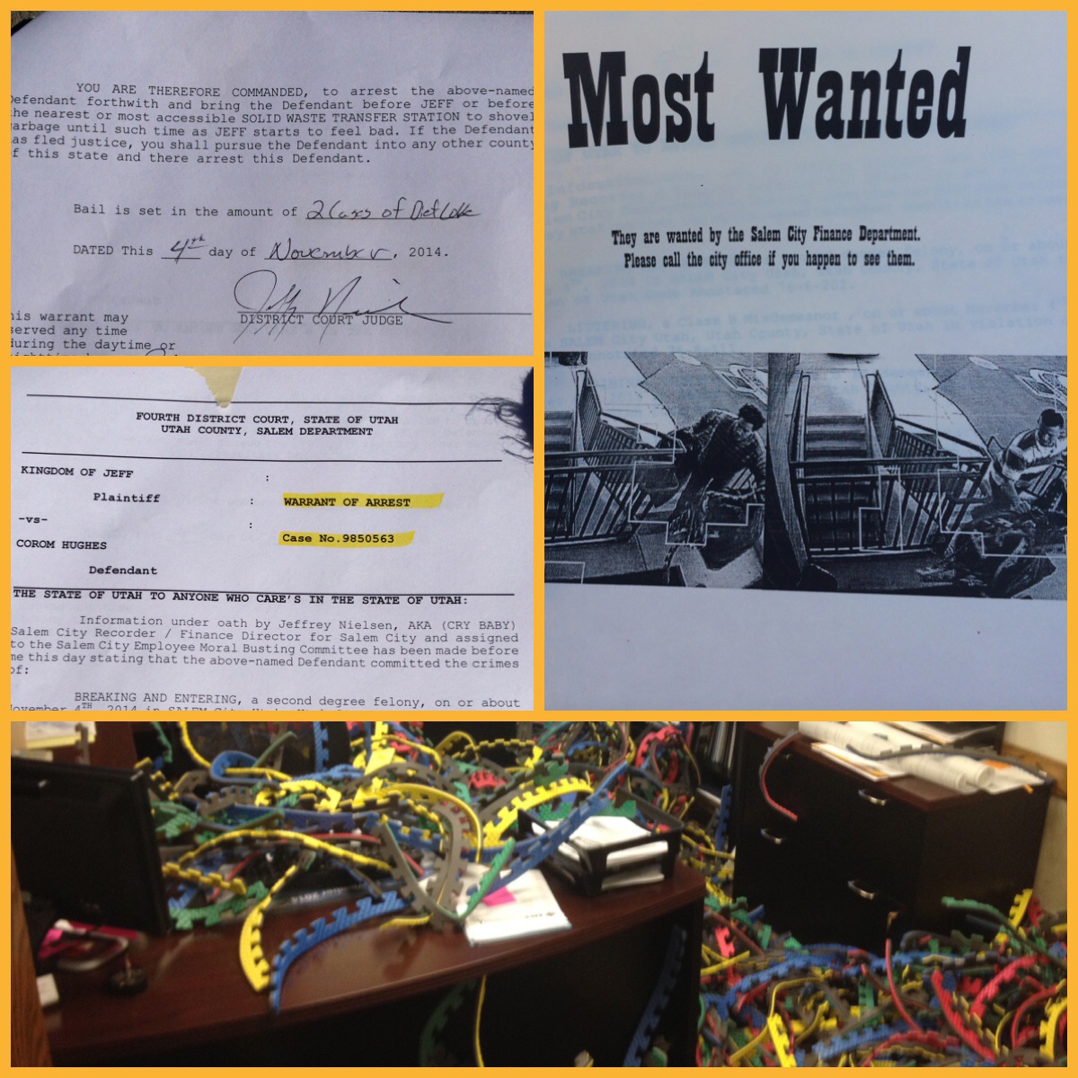 I finished off with a 15 minute cool down… Totaling my miles to about 12 1/2-13 miles. I was so happy to have finished this workout!!! It was a tough one but I was so grateful to have these 2 show up because it made me get out of bed knowing they were waiting for me! I babysat all morning and into early afternoon. I did have some school PTO stuff to take care of so the newborn came with me. He was hard today (just cried a lot) but what do you do. 🙂 Corom and Travis Barney earlier this morning went to a friend of ours work. It’s his birthday today… He works at the city office. We arranged it with someone to let them in and make a “mess” of his office…