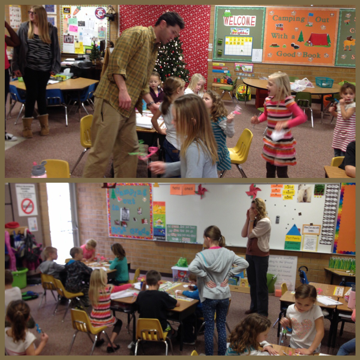 Corom went to our 1st grader’s (2nd child) class and read a Christmas book to the class and then made a candy cane reindeer.