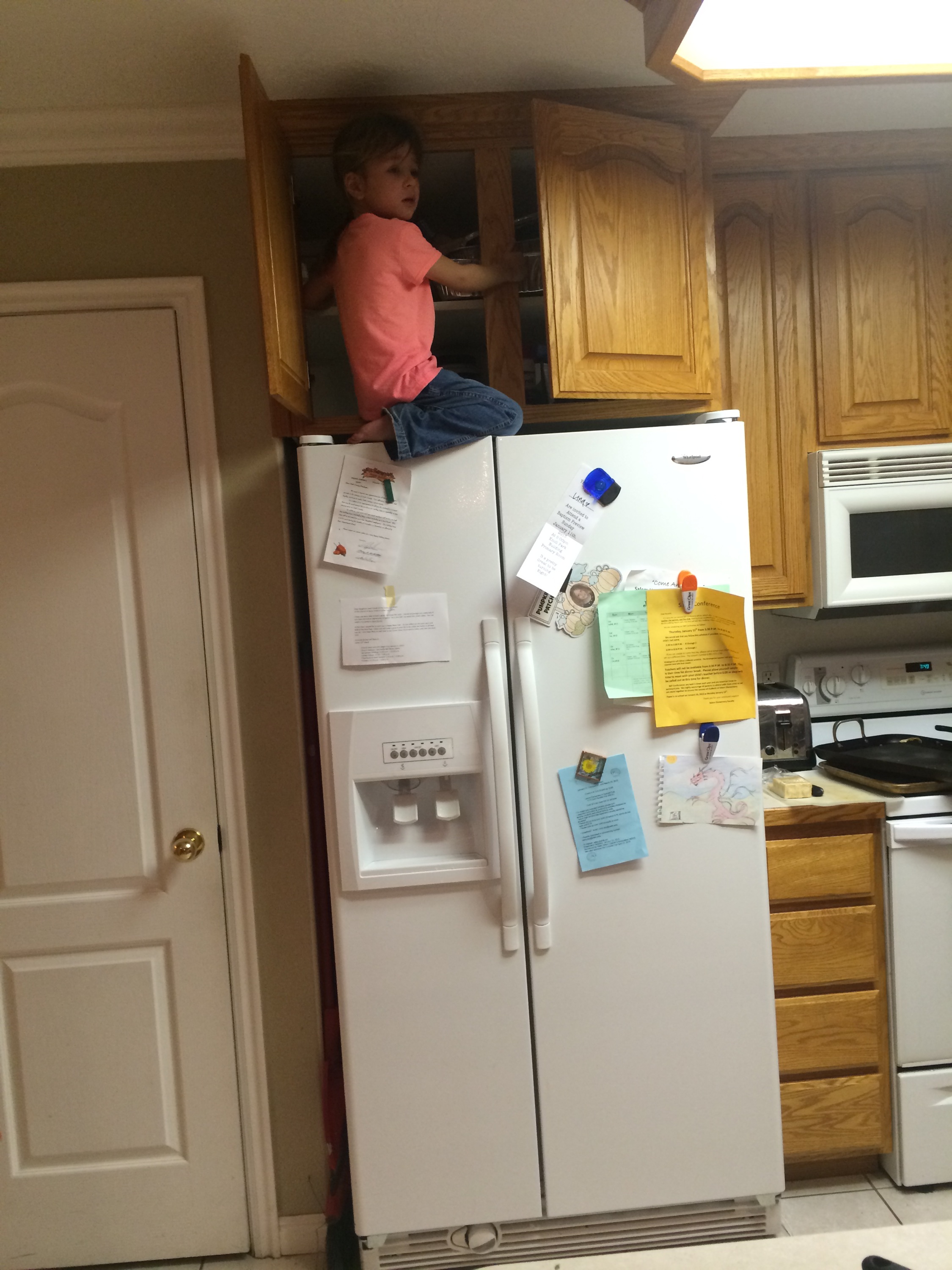How did your daughter get on top of the fridge?! That is so funny and reminds me of when I lived in Indianapolis for skating. A young family had just moved there from Africa where they were missionaries since the kids were born. The kids could climb on anything, including up the lockers. They said it was because the grew up climbing trees! I also remember the little boy eating kiwis whole.