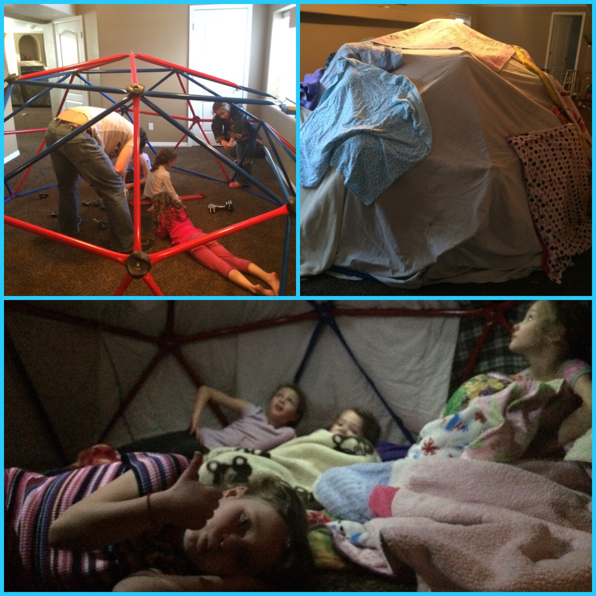They loved it. Me… I just kept thinking, what a mess this is with all the blankets… Oh well! It kept them busy the rest of the afternoon. We had the Barney’s and Fullmer’s over for dinner and family night. The girls then slept in the jungle gym (dome) fort.