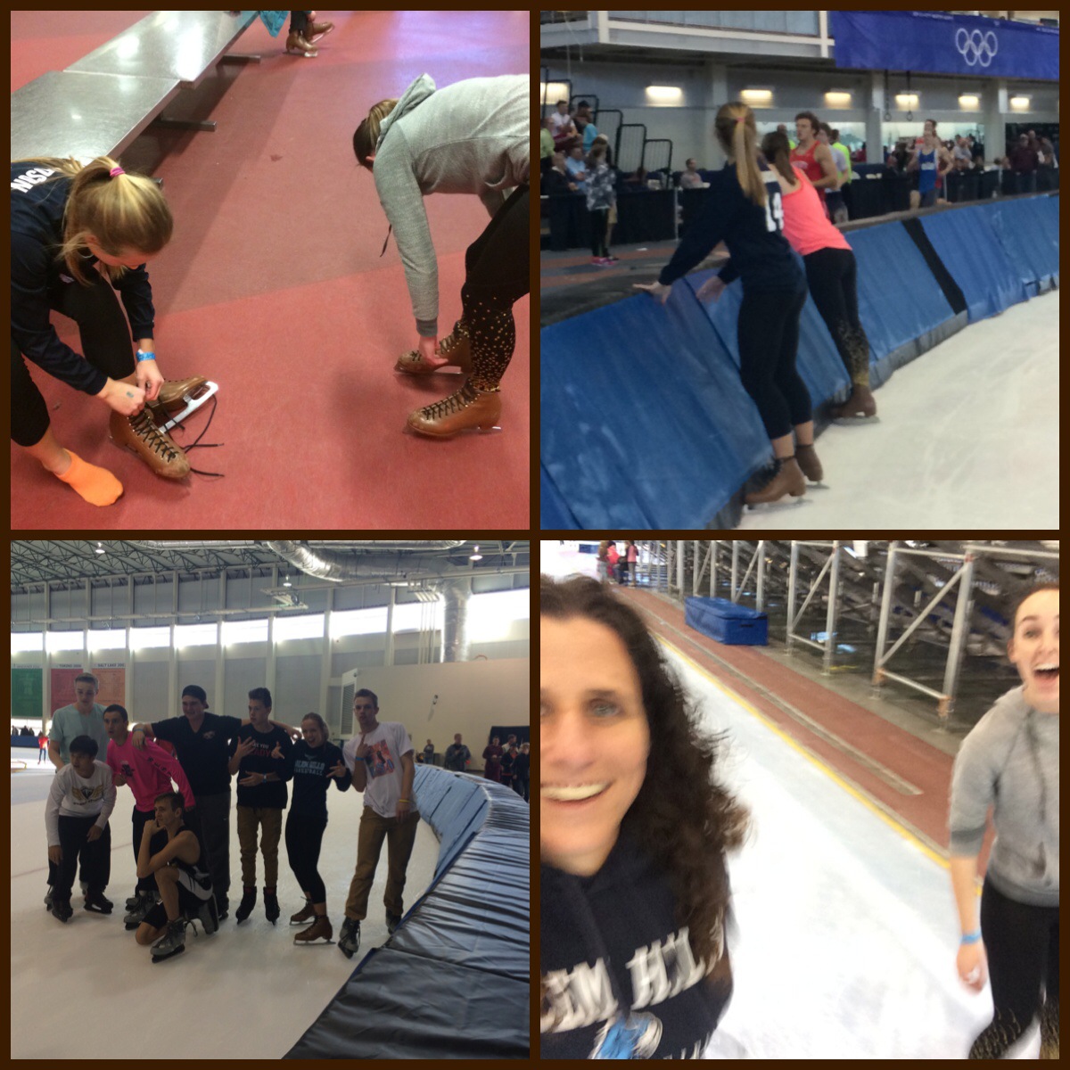 During the 200’s (97 heats of 200’s :/), a couple of the girls we coach and I went ice skating on the rink that is in the middle of the track. 🙂 (Sarah, I thought of you and your ice skating days when I struggled just to make it around the rink once…) It sure was fun but the skates rubbed my ankles raw.