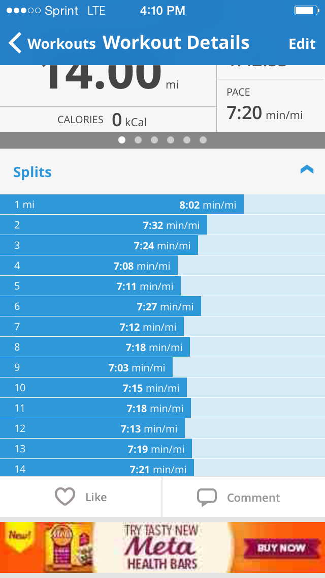 We ran 14 miles (they finished at 15). It was a good run… My legs just felt tired!!!