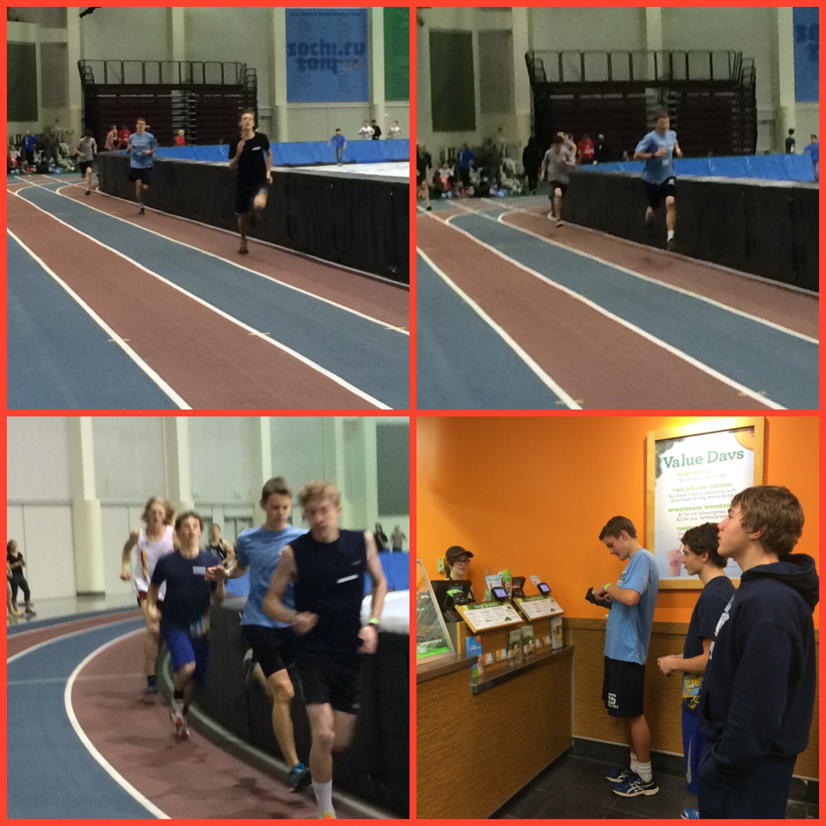 Indoor Track: The HS kids practice on their own on Wednesdays and on Thursday they went on a 5 1/2 to 7 mile easy to moderate run. Some of the kids have a track meet on Friday and most are going to the sweethearts dance. Which leads to Friday night… I took a handful of kids to the Olympic Oval indoor track for the meet. They raced really well!!! One of the sophomores pulled off a 30 second PR in his mile! And of course we had to stop and get Jamba Juice (smoothies) for our drive home! 🙂