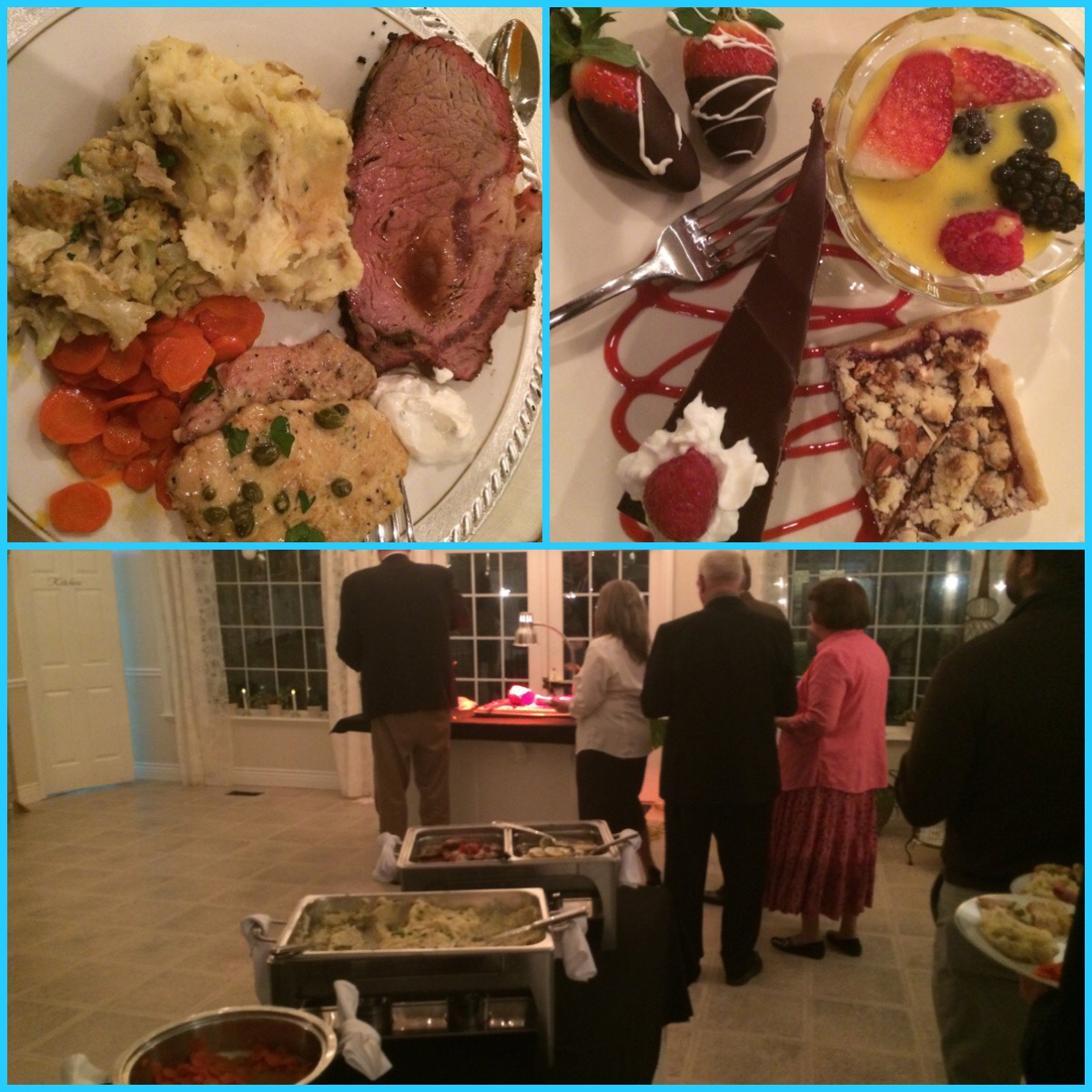 Dinner was excellent!!! We had prime rib, raspberry chicken, lemon chicken, mashed potatoes, carrots, salad, rolls, desserts and more. It was wonderful!!!