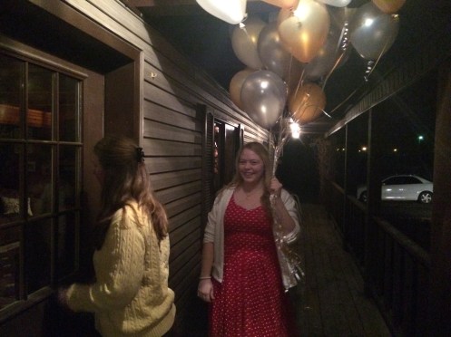 Travis and his little girl were over to help (Corom) with the girls, too. Megan, Julie, Jessica and I ran over to a friends to sing Happy Birthday… We took all the balloons from the dinner. 🙂